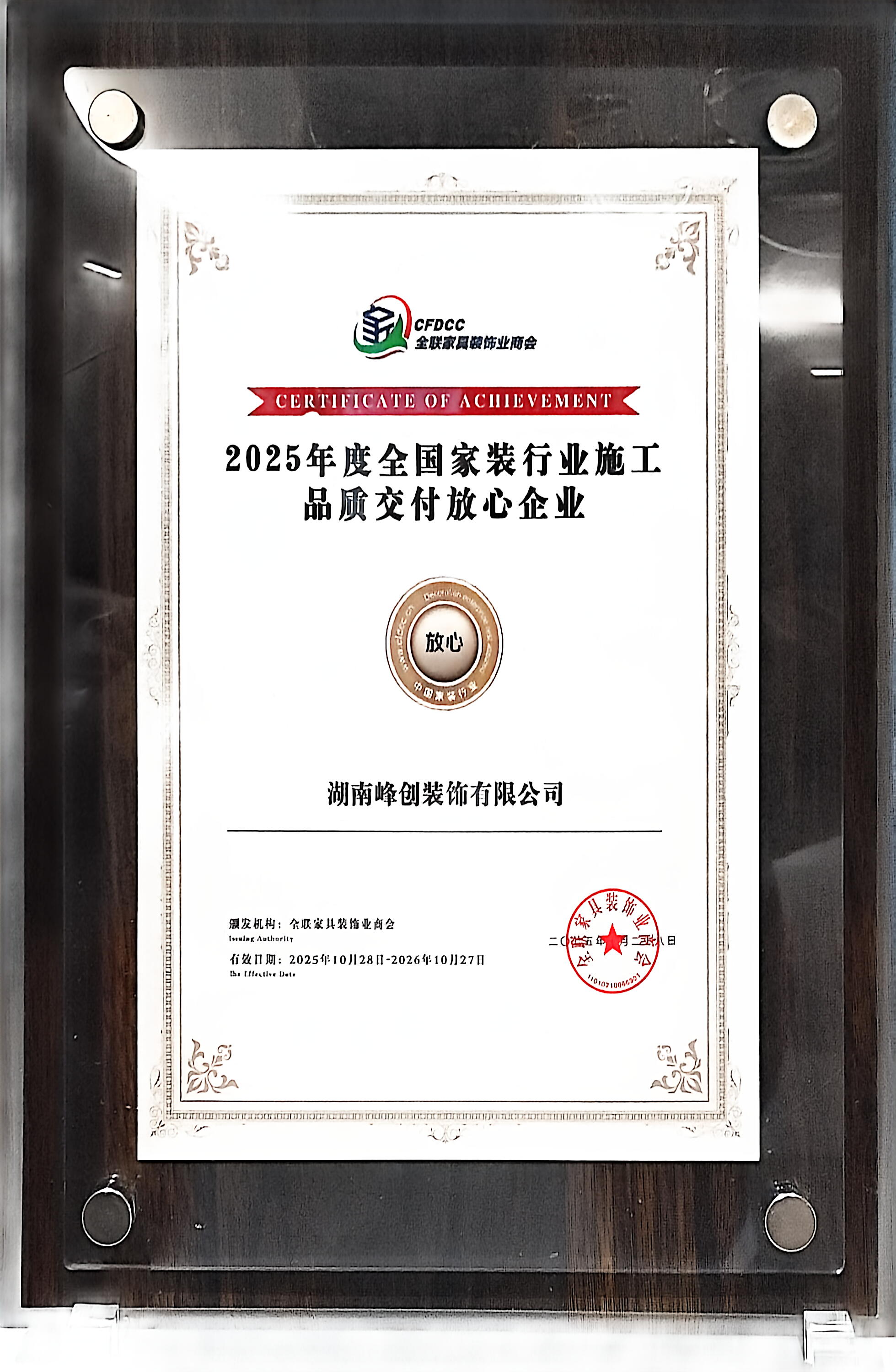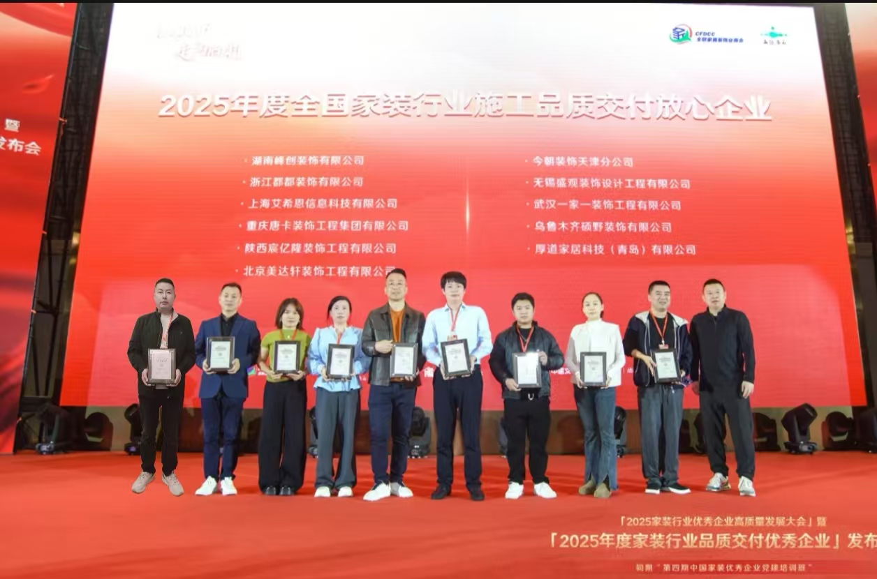 本次表彰中,峰创装饰集团凭借在项目管理、施工交付等领域的突出表现,荣获“2025年度全国家装行业施工品质交付放心企业”。这份奖项的背后,是峰创 14 载深耕中高端家装领域的匠心沉淀,更是行业对峰创 “以标准化保障交付质量” 理念的高度认可。
