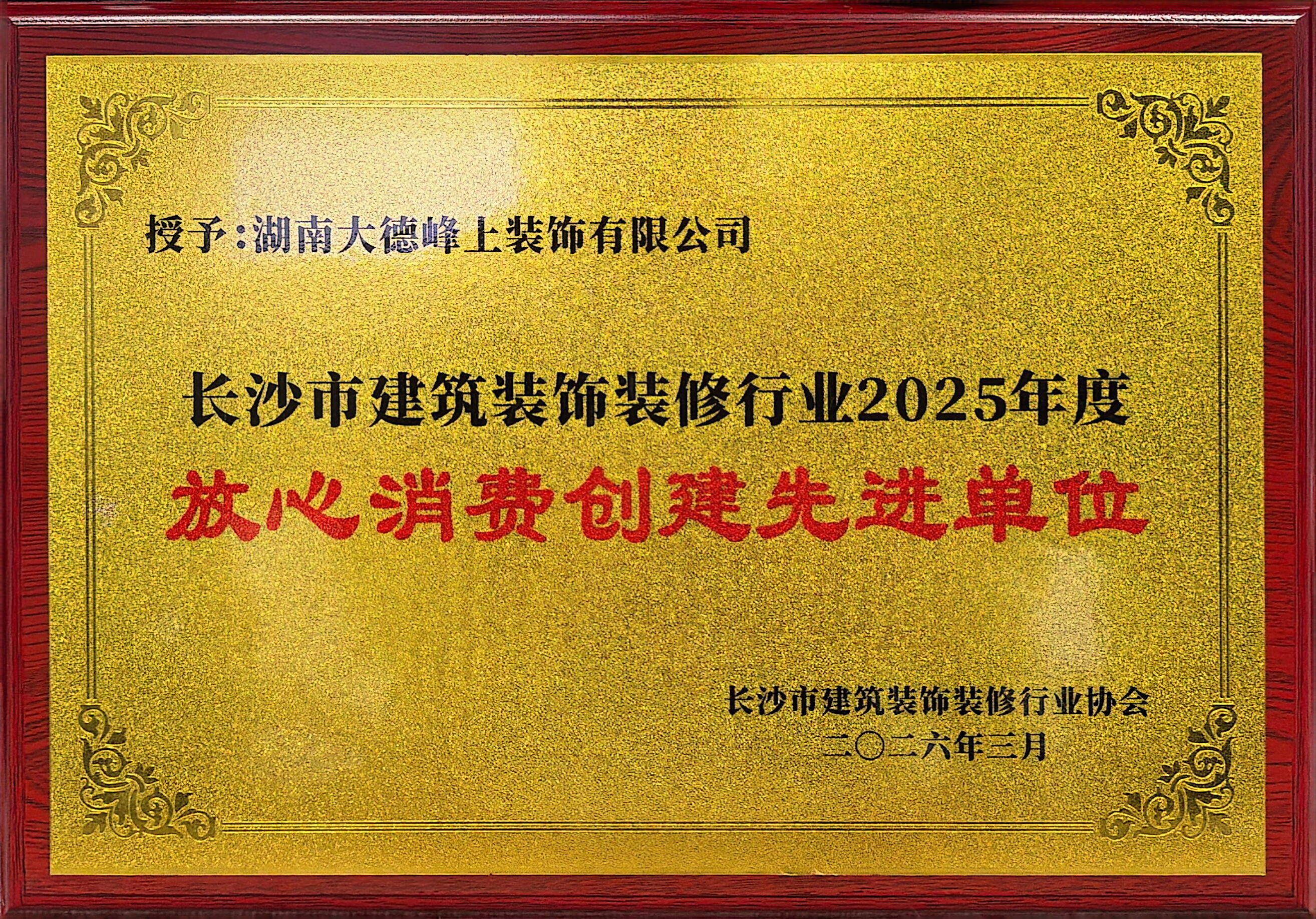 3・15 国际消费者权益日之际,长沙市建筑装饰装修行业 2026 年 3・15 主题宣传暨行业放心消费创建总结会圆满举行,大德峰上整装受邀参与本次盛会,并凭借在整装领域的优质服务、严苛品控与诚信经营,成功斩获行业2025年度“放心消费创建先进单位”,这份荣誉既是行业对大德峰上的高度认可,更是市场与消费者对品牌的坚实信赖。
